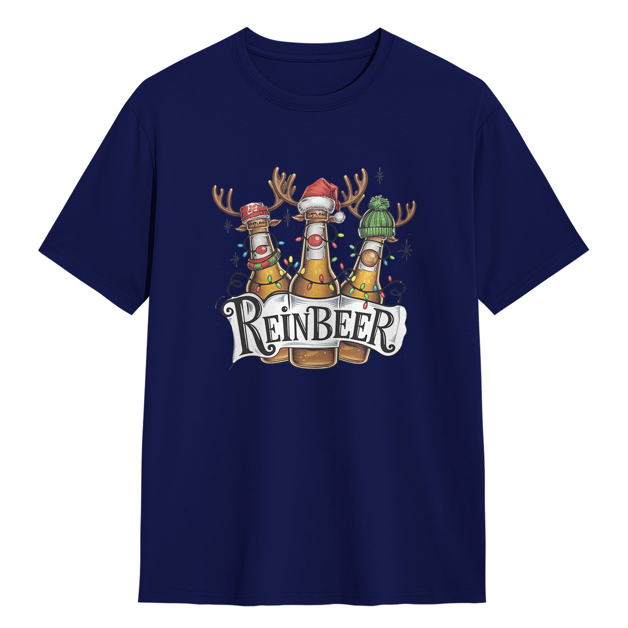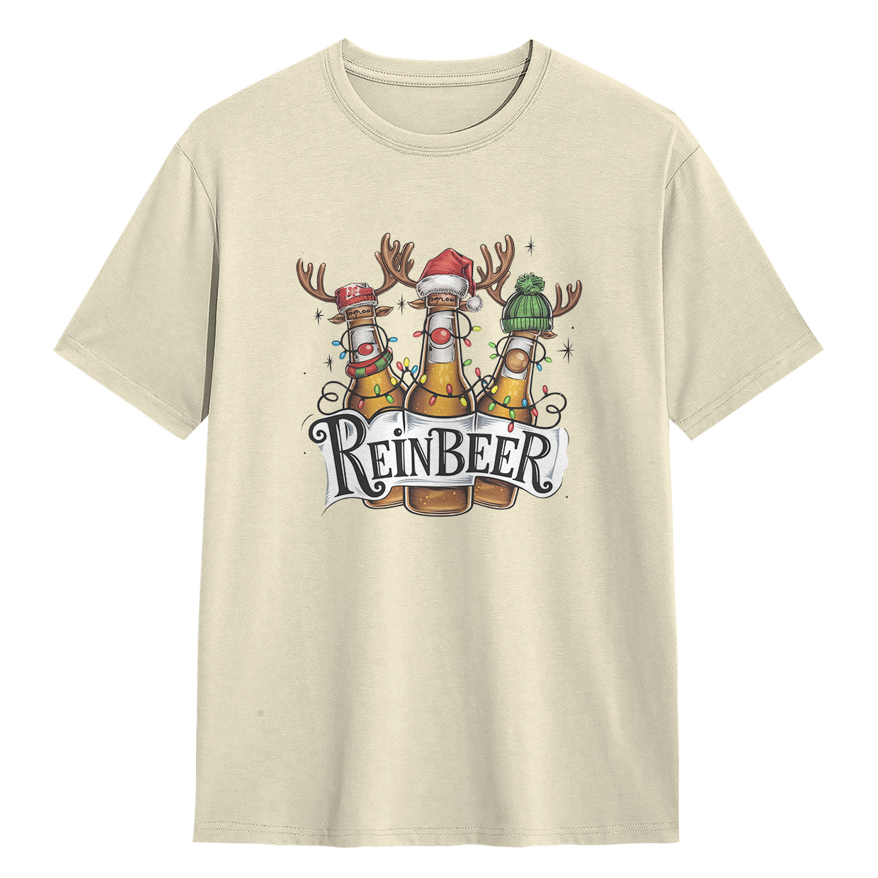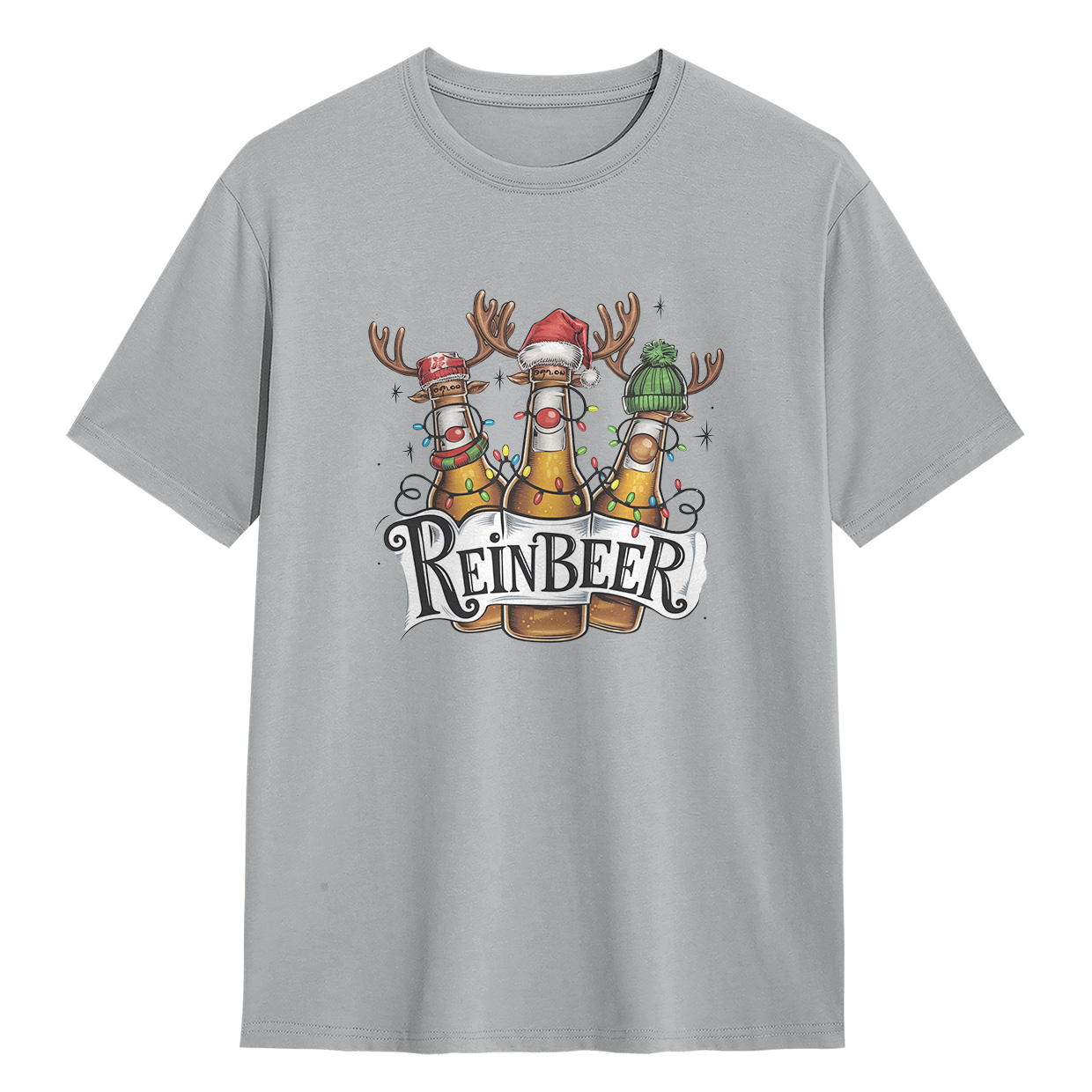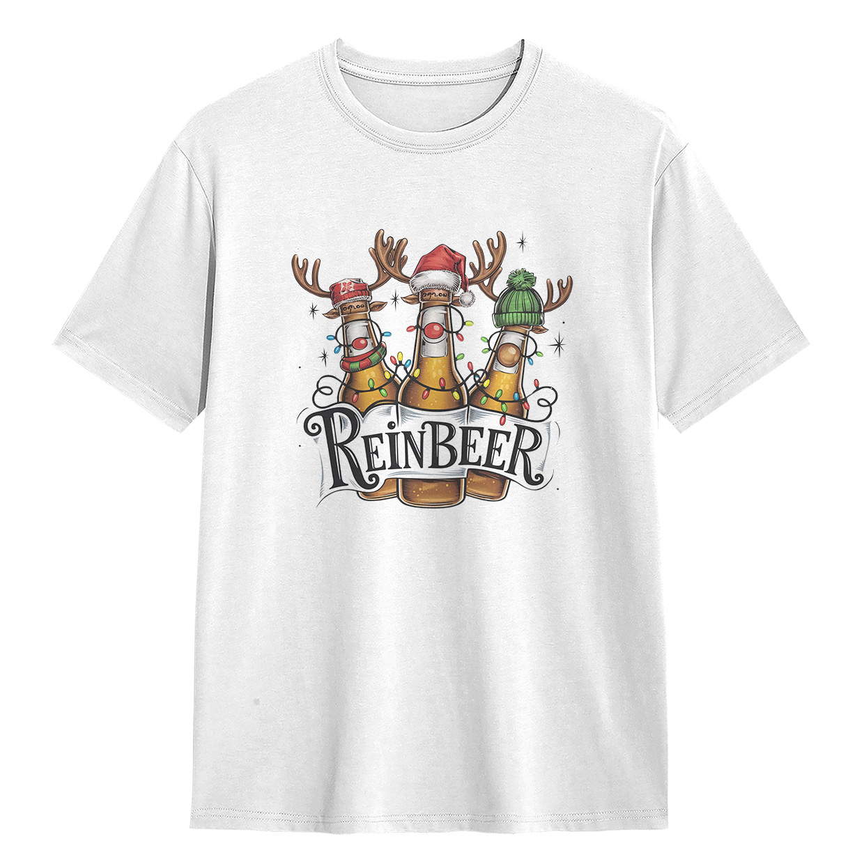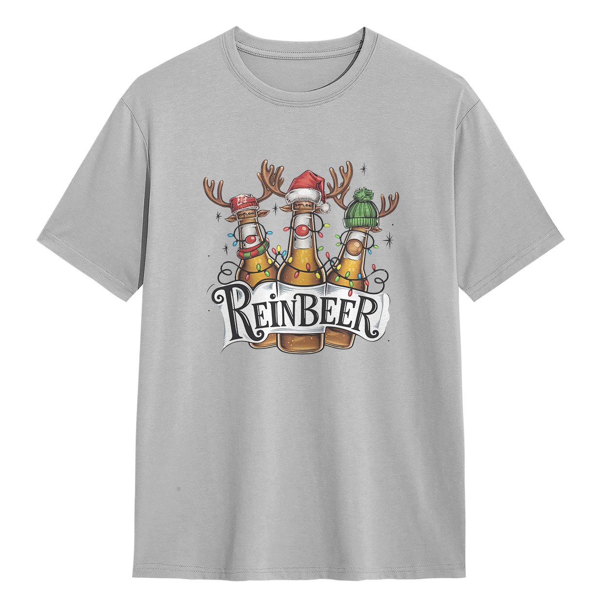 Kaos ReinBEER Edition ini hadir dengan desain unik botol bir jadi rusa lengkap dengan hiasan Natal. Cocok banget buat kamu yang suka tampil beda dan penuh humor.