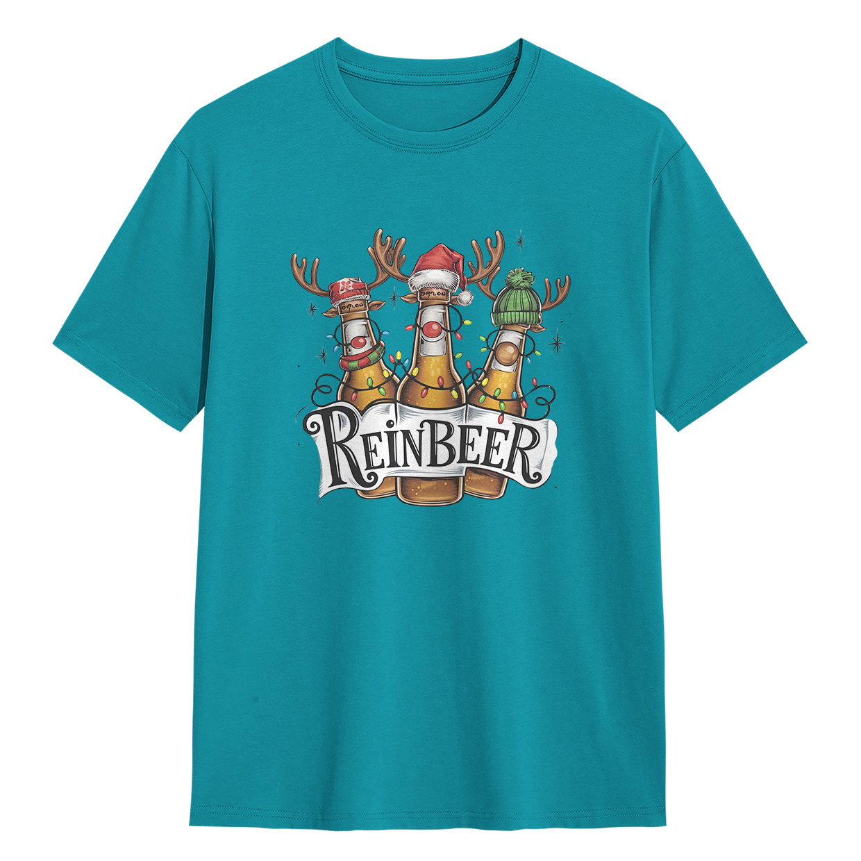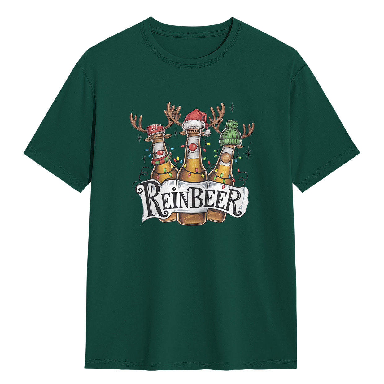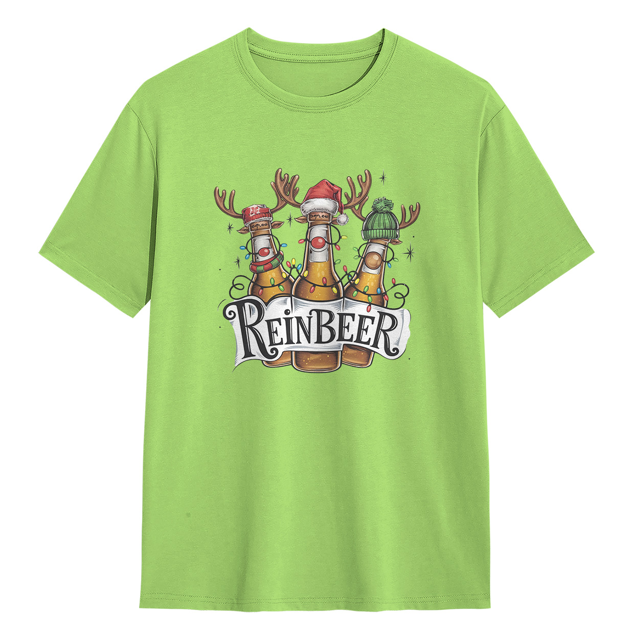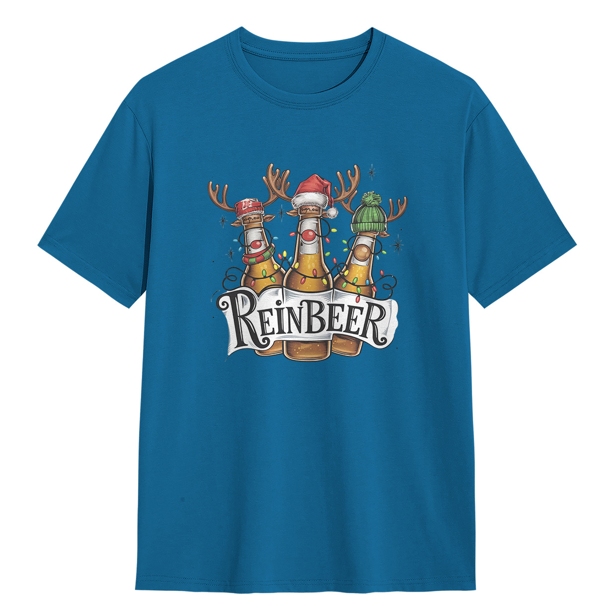 Kaos ReinBEER Edition ini hadir dengan desain unik botol bir jadi rusa lengkap dengan hiasan Natal. Cocok banget buat kamu yang suka tampil beda dan penuh humor.