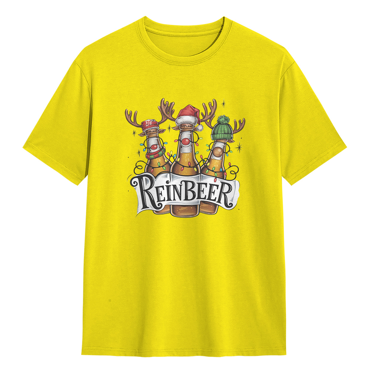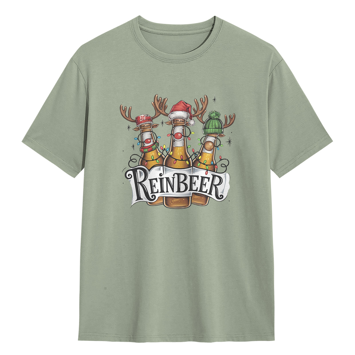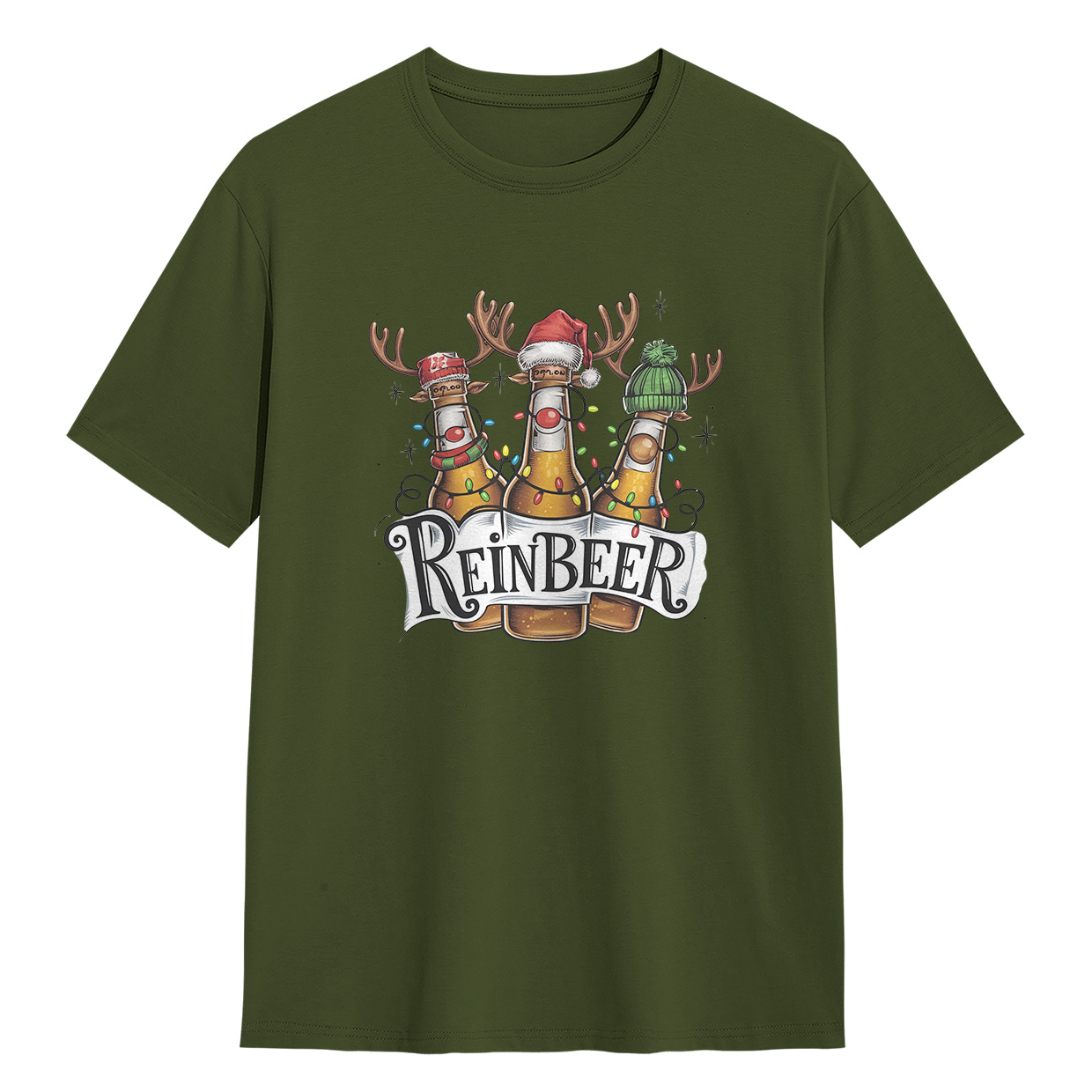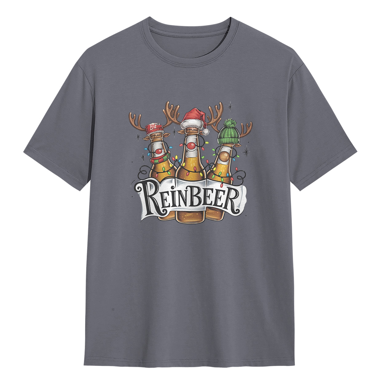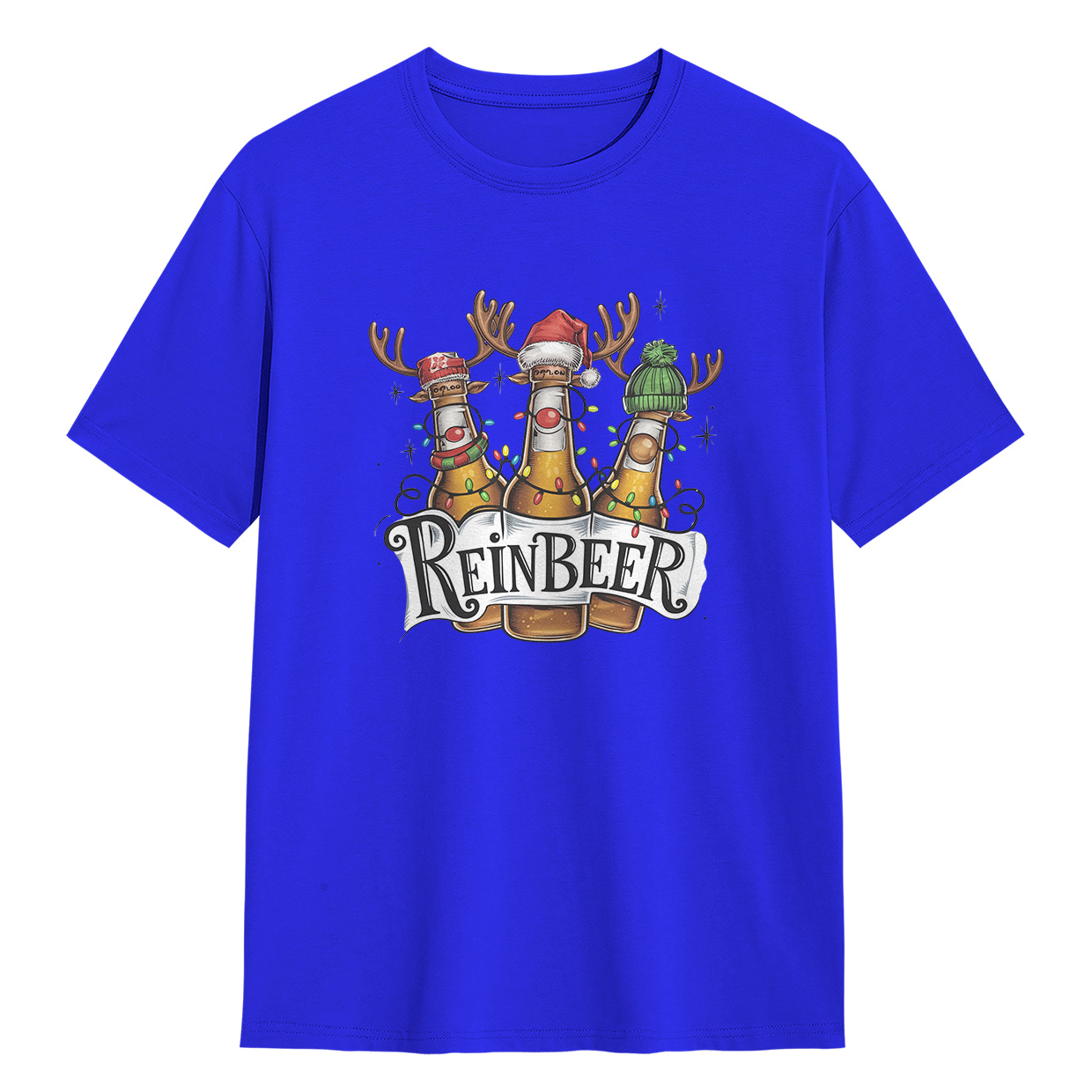 Kaos ReinBEER Edition ini hadir dengan desain unik botol bir jadi rusa lengkap dengan hiasan Natal. Cocok banget buat kamu yang suka tampil beda dan penuh humor.