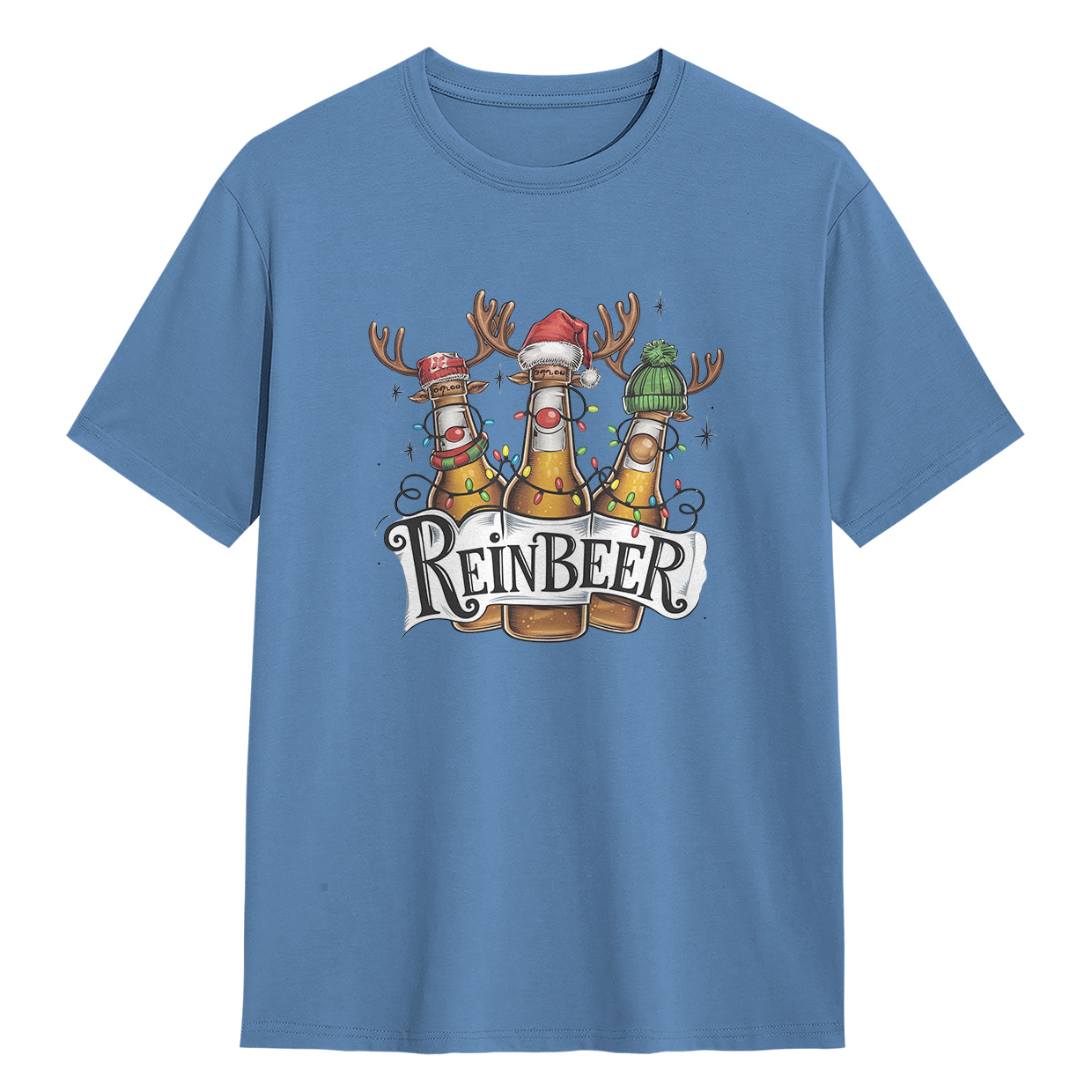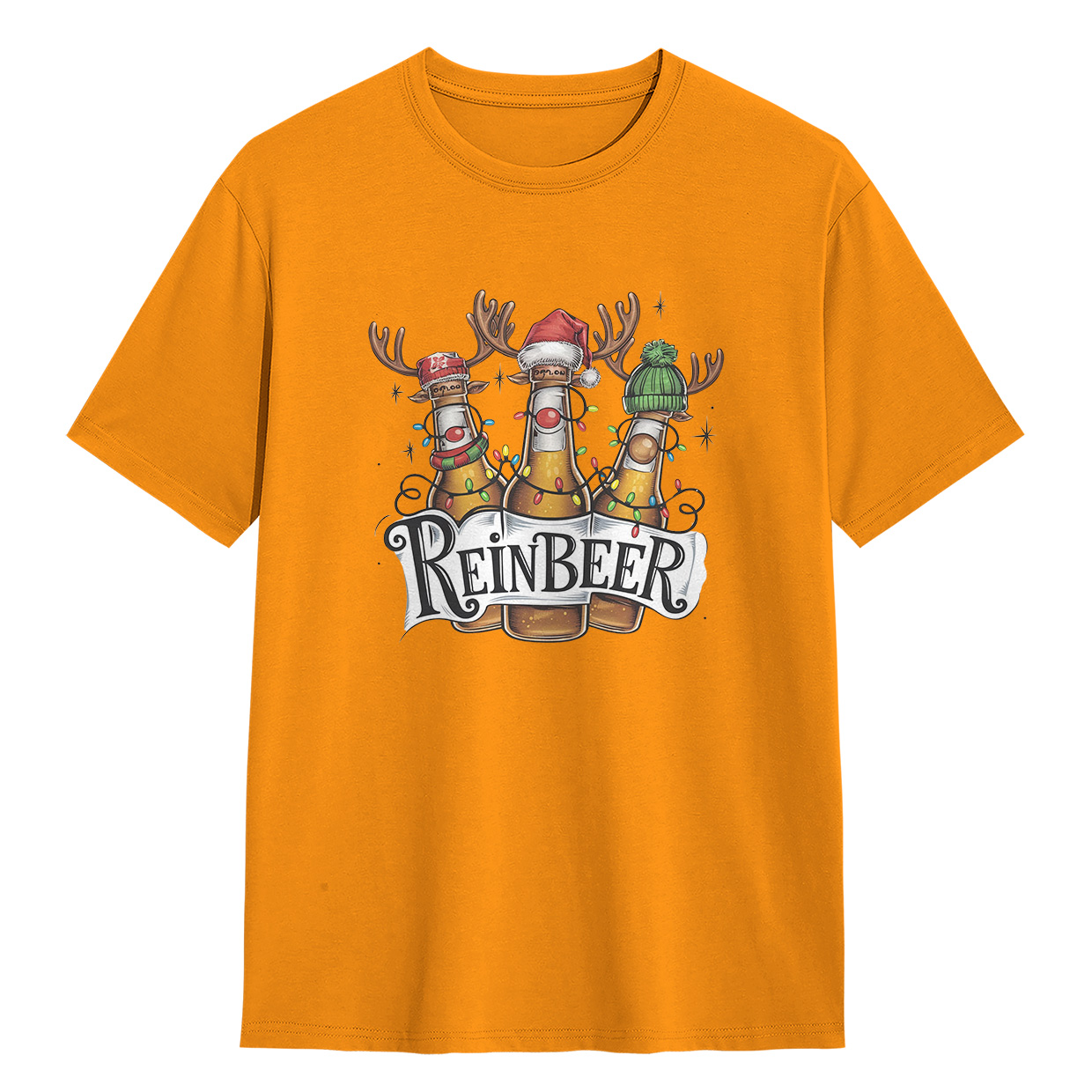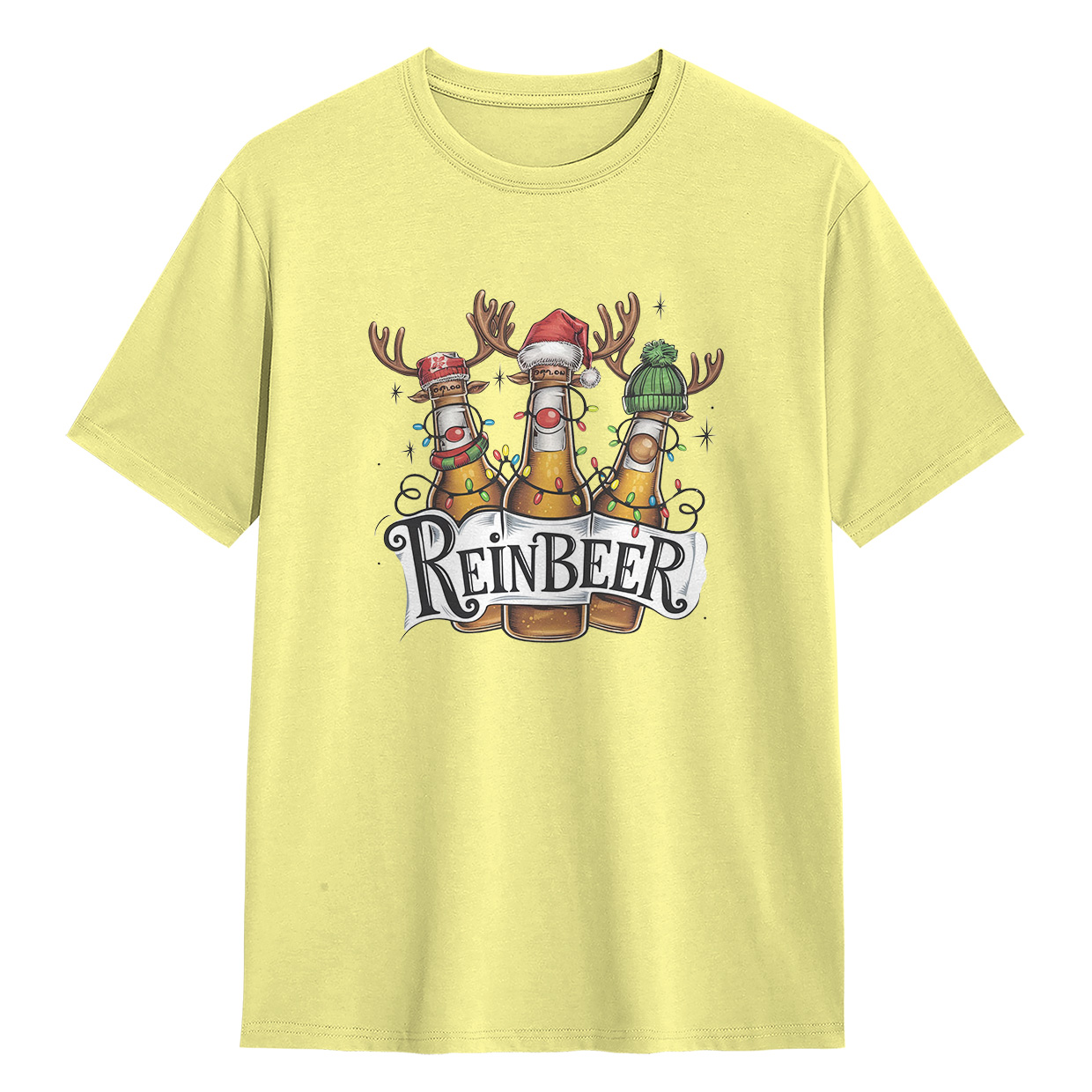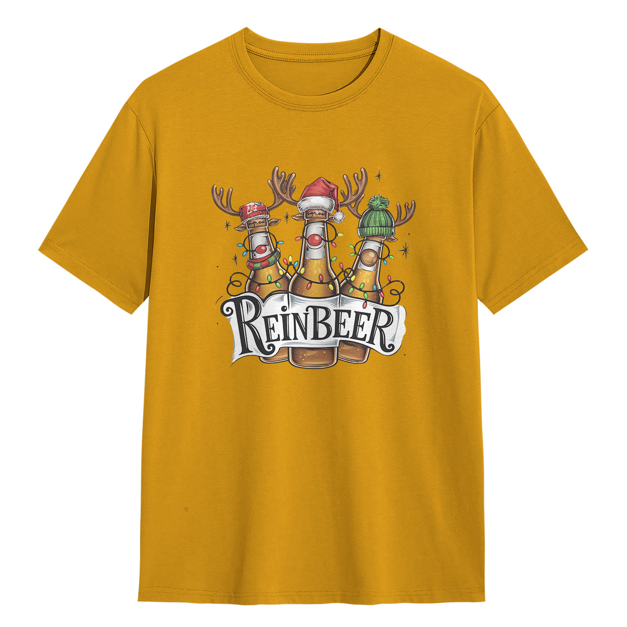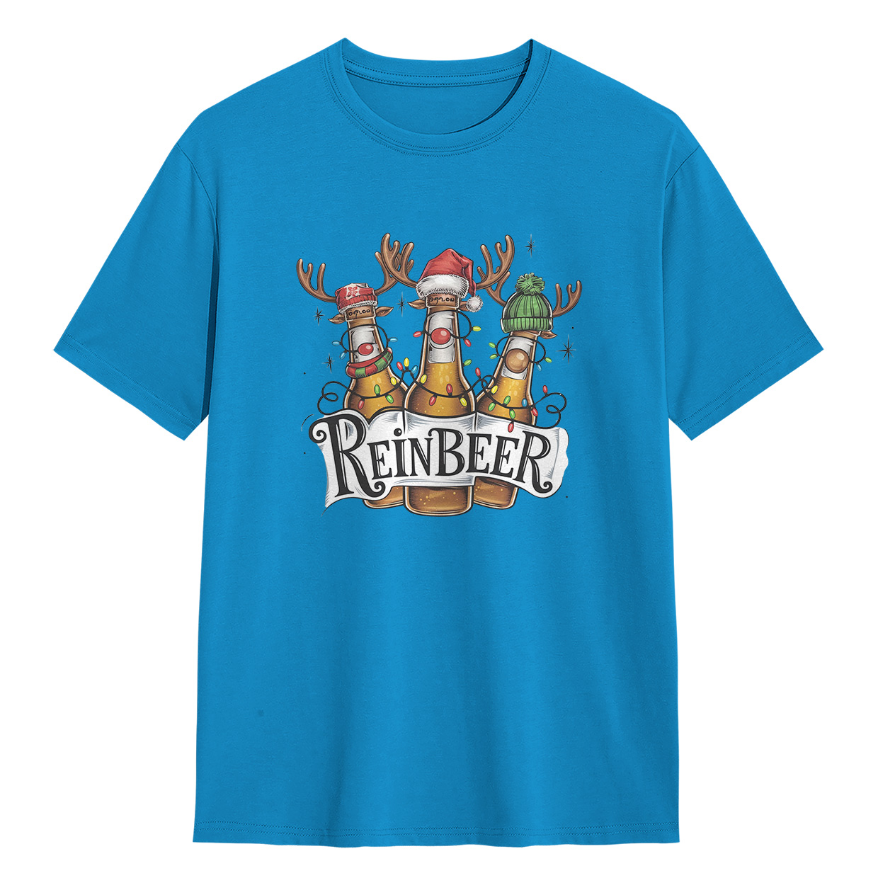Kaos ReinBEER Edition ini hadir dengan desain unik botol bir jadi rusa lengkap dengan hiasan Natal. Cocok banget buat kamu yang suka tampil beda dan penuh humor.